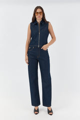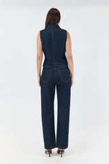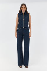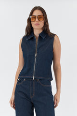 Introducing a sleeveless denim vest with a tailored fit that accentuates the waist. Featuring a centre front two way zipper it offers a polished yet edgy look. Pair it with our denim pants or short for a sleek denim-on-denim ensemble.