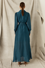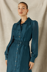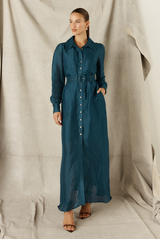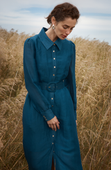 SOFIA IRINA shirt dress is made from a luxurious linen silk blend, it features gold detailed buttons and our signature blue color way. A season must have.