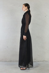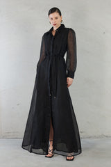 This classic yet contemporary shirt dress in Black from AW 25 Collection. Crafted from a silk linen blend into a long, button-down shirting silhouette. A long sleeved silhouette with a buttoned up cuff, pointed collar and a self tie belt to clinch in the waist.