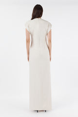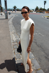 It features a round neck, exaggerated shoulders, centre back zipper closure and side split. The go to dress for any event.